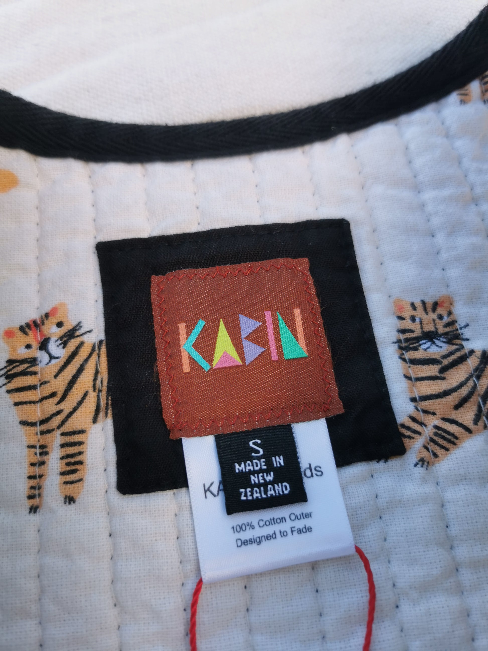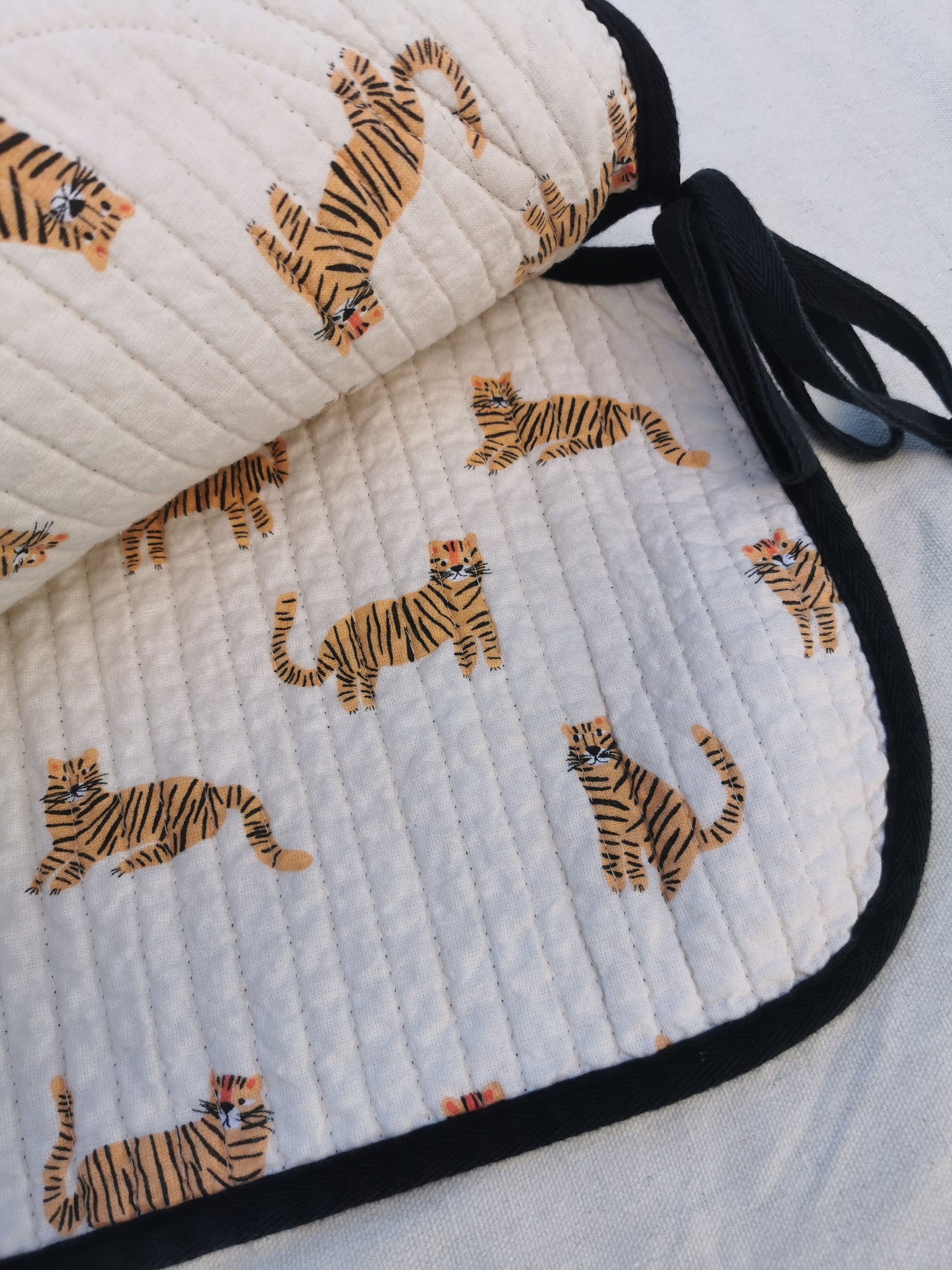 Warm and squishy quilted side tie vest made from linen cotton outer and a printed tiger cotton lining and interlined with bamboo cotton wadding.