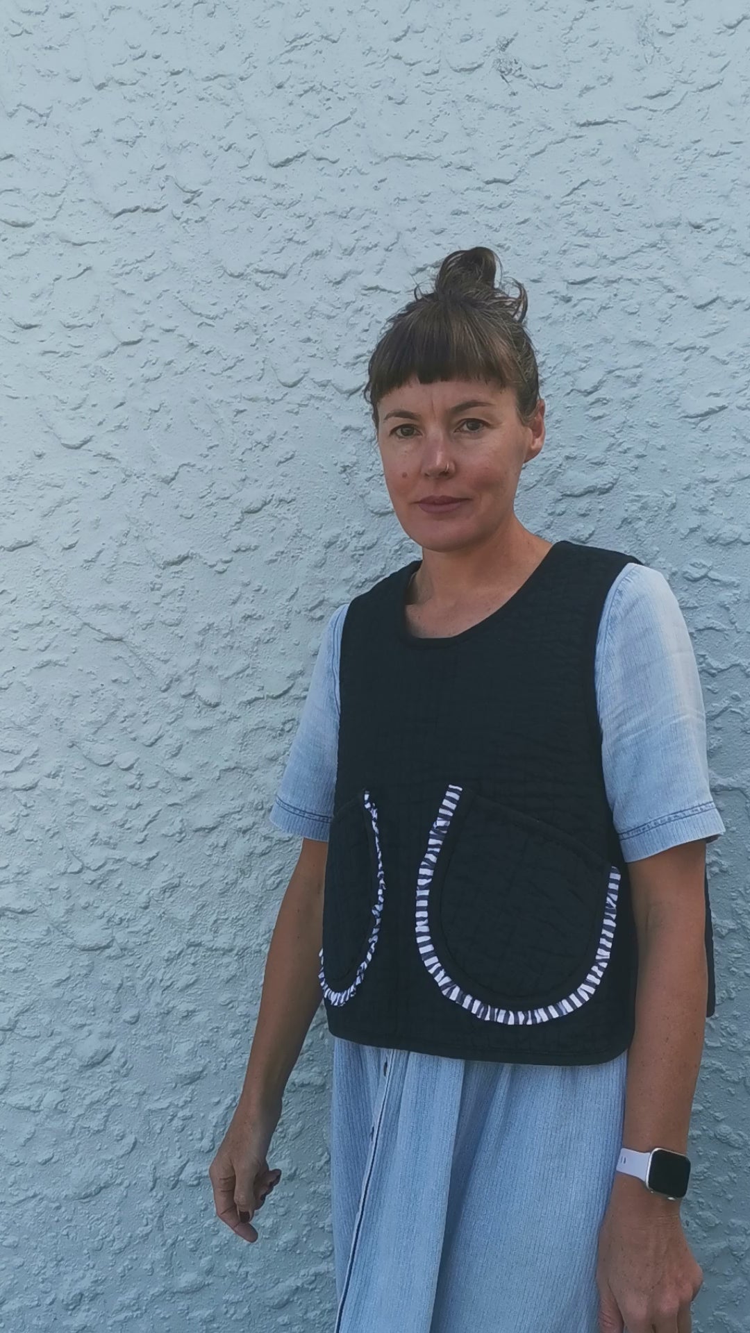 QUILTED VEST - Size S - Black Linen Cotton with Side Ties