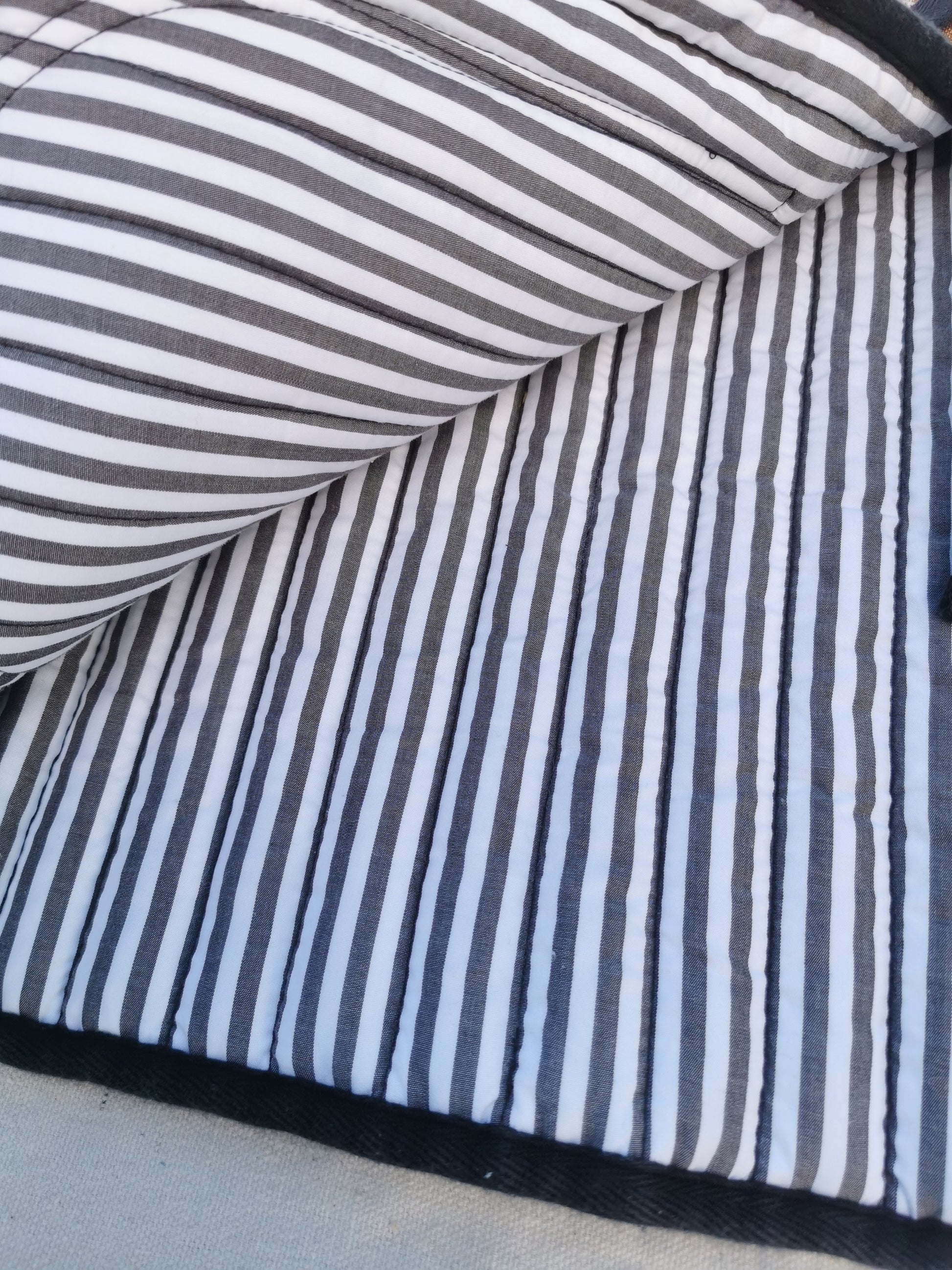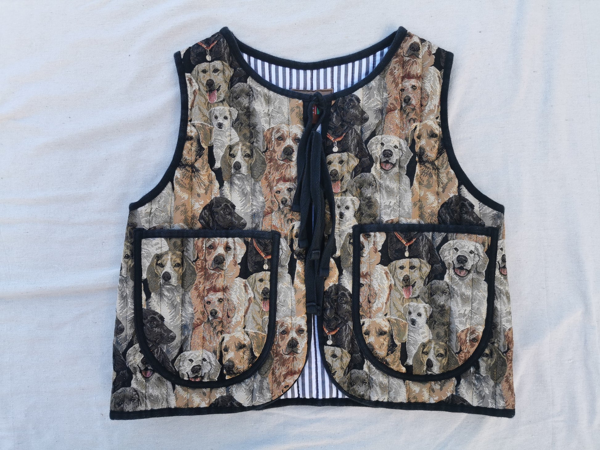 Warm and squishy quilted vest made from quilted tapestry outer and striped cotton lining and interlined with thick polyester wadding.