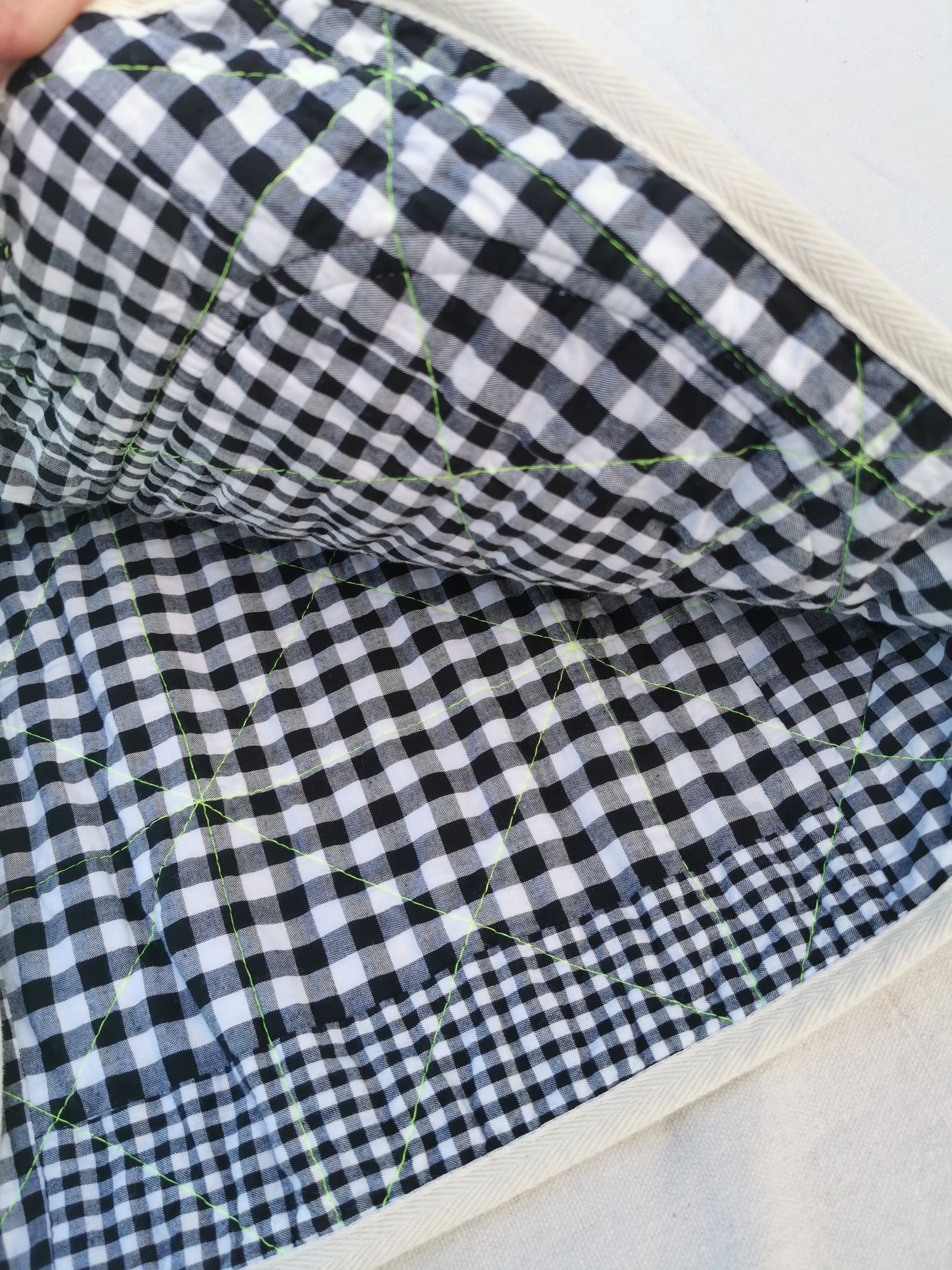Warm and squishy quilted vest made from quilted cotton canvas outer and patchwork cotton gingham lining and interlined with bamboo cotton wadding.