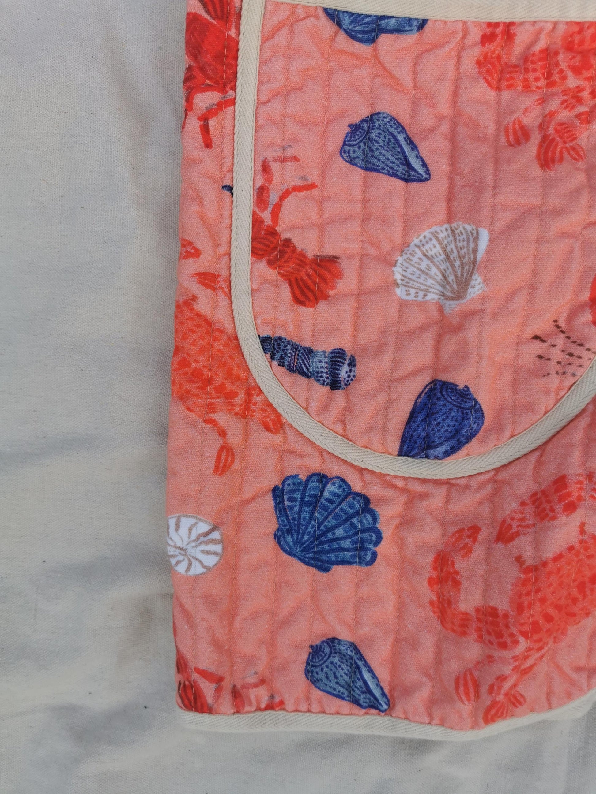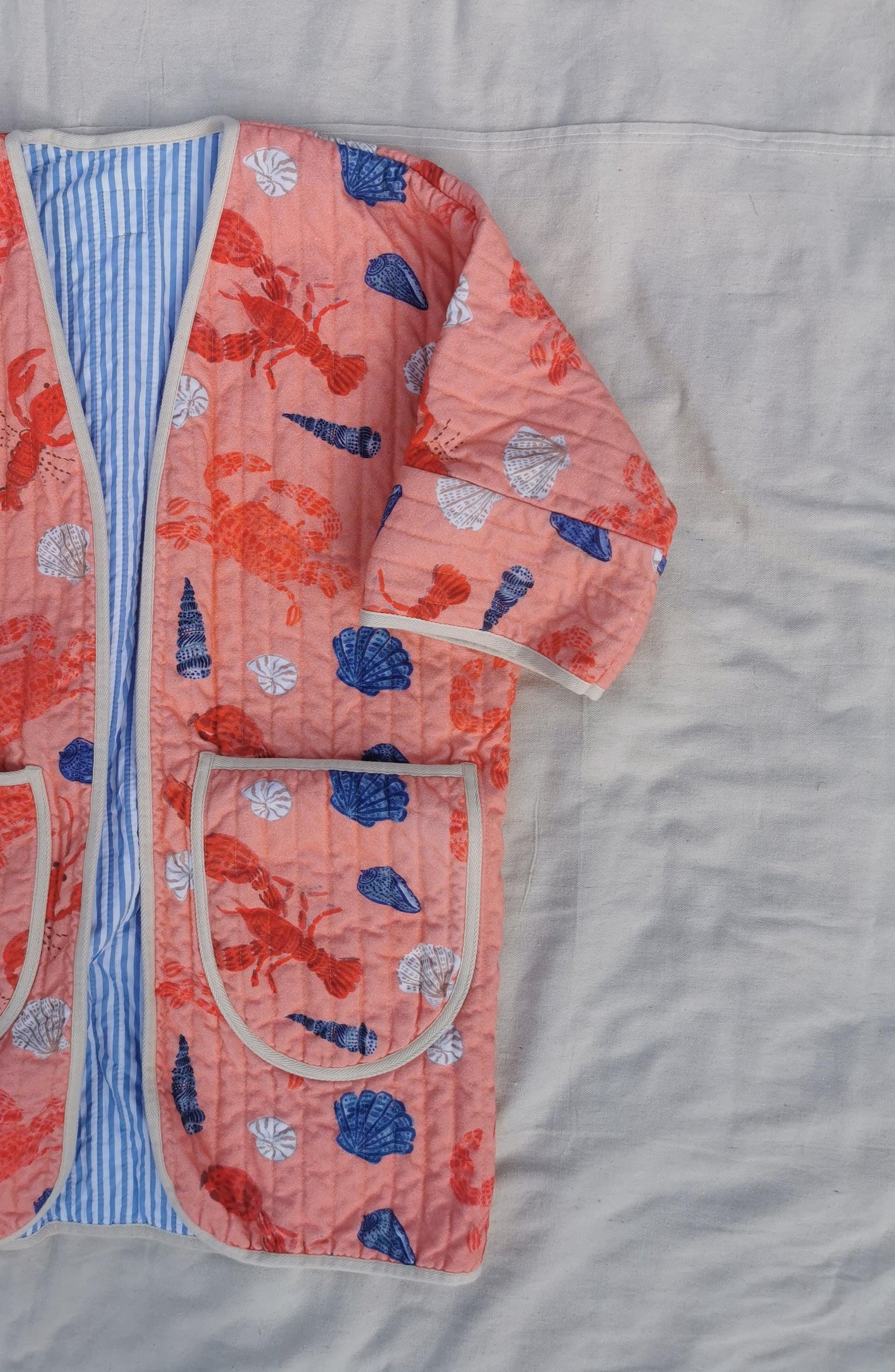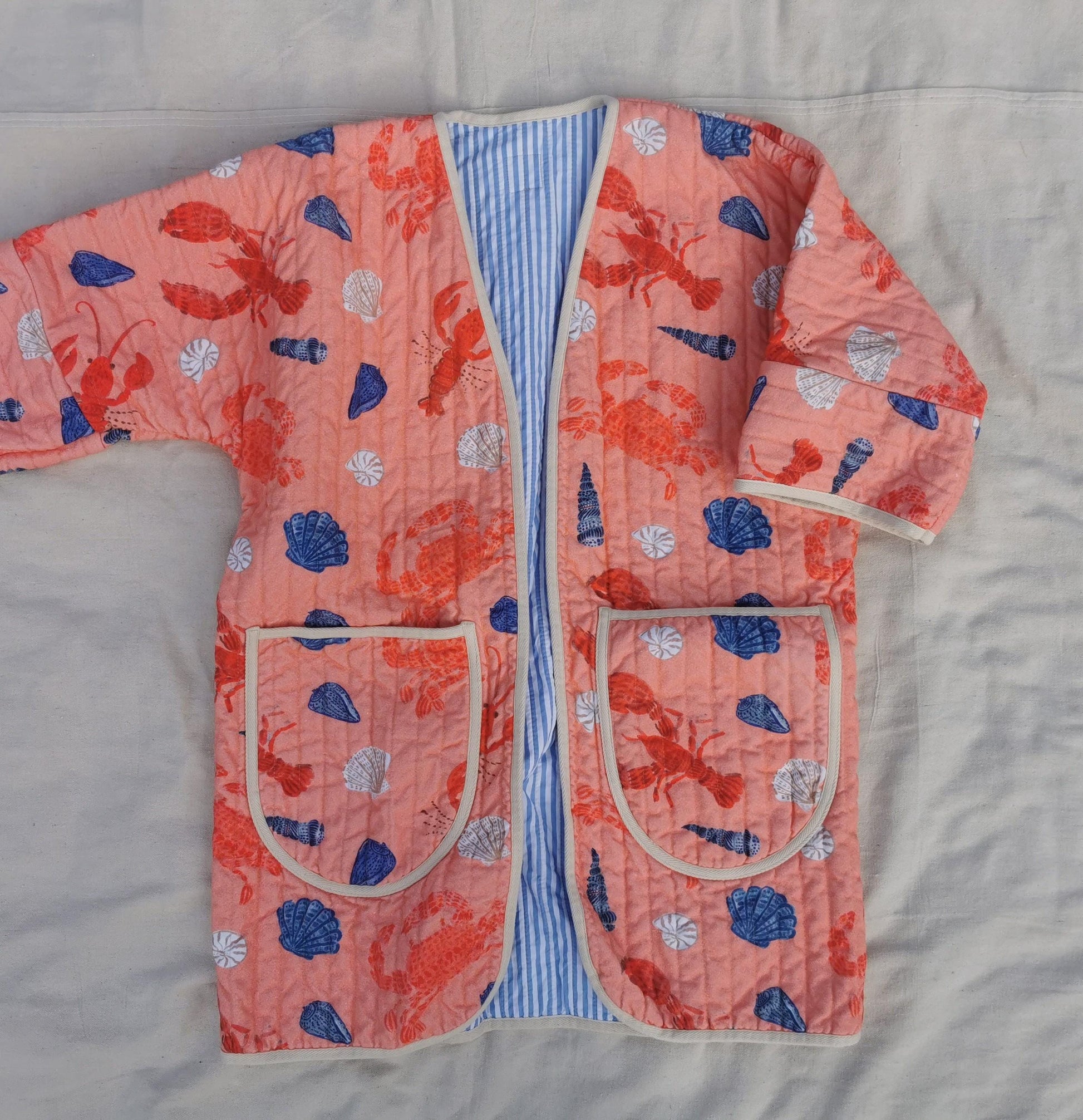 Warm and squishy quilted coat made from a fantastic peachy lobster printed cotton canvas, lined with a striped blue cotton and interlined with bamboo cotton wadding. No collar, no closures. The cropped sleeves on this style are extra roomy to allow for layering. Big pockets, large enough to carry everything and low enough to put your hands in. All seams have been bound in colourful bias binding (internal seams bound in natural cotton twill tape), making this jacket heirloom quality.