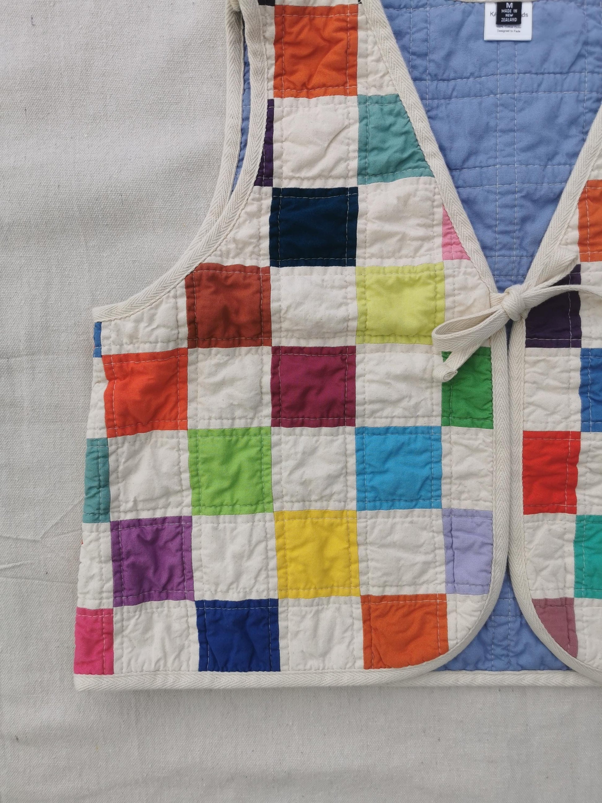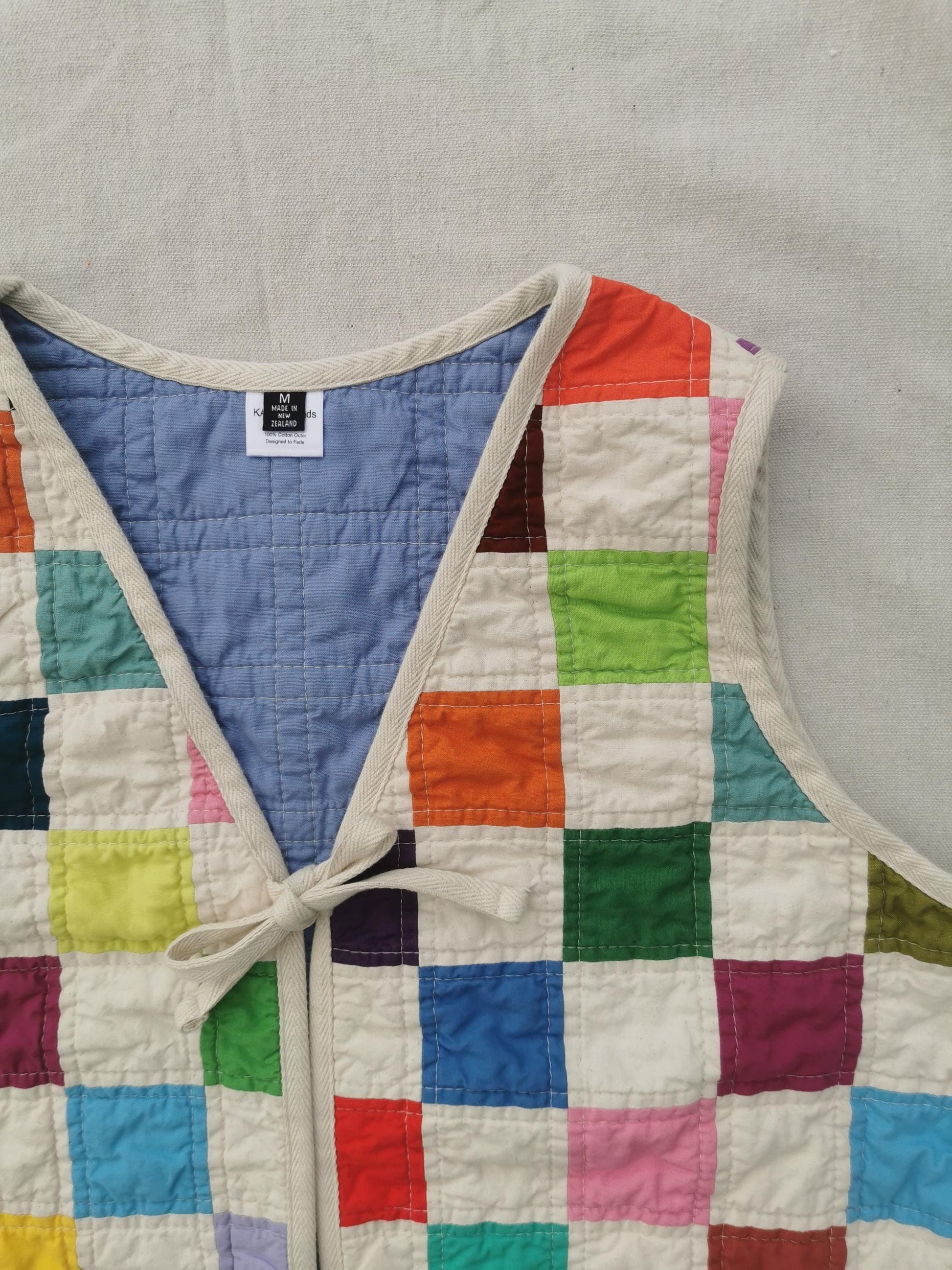 Warm and squishy quilted vest made from patchwork cotton outer and a cornflower blue cotton lining and interlined with bamboo cotton wadding. Closes at the front with a tie. All seams have been bound in natural cotton twill tape making this vest heirloom quality and very sturdy.